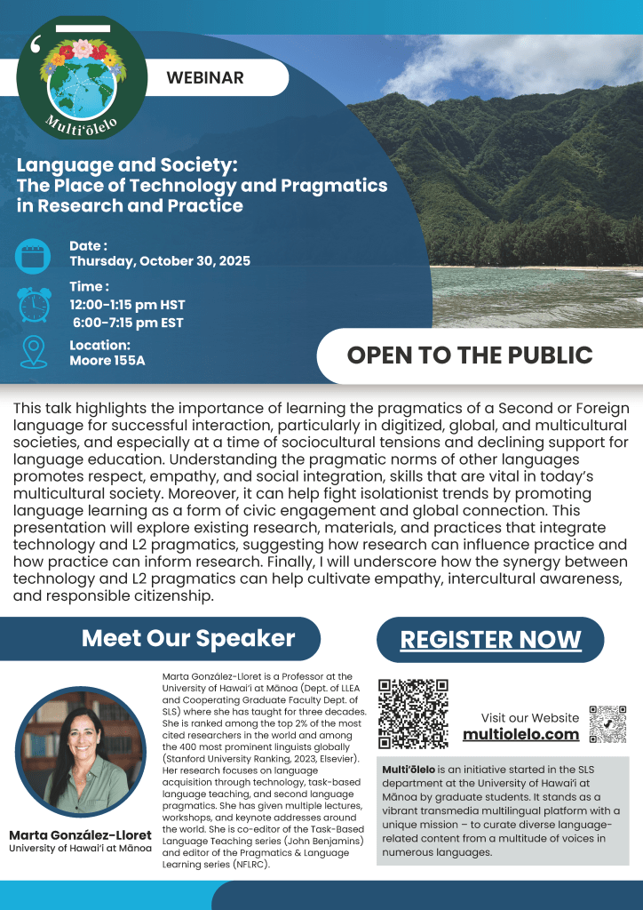 Marta González-Lloret is a Professor at the University of Hawai‘i at Mānoa (Dept. of LLEA and Cooperating Graduate Faculty Dept. of SLS) where she has taught for three decades. She is ranked among the top 2% of the most cited researchers in the world and among the 400 most prominent linguists globally (Stanford University Ranking, 2023, Elsevier). Her research focuses on language acquisition through technology, task-based language teaching, and second language pragmatics. She has given multiple lectures, workshops, and keynote addresses around the world. She is co-editor of the Task-Based Language Teaching series (John Benjamins) and editor of the Pragmatics & Language Learning series (NFLRC).