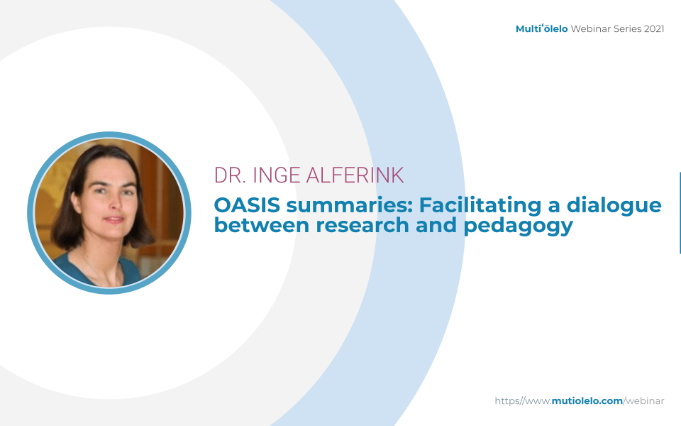 Dr. Inge Alferink received her PhD in Linguistics from the Radboud University Nijmegen and IMPRS for Language Sciences in the Netherlands. She now works in the UK for the OASIS initiative and the National Centre for Excellence for Language Pedagogy.