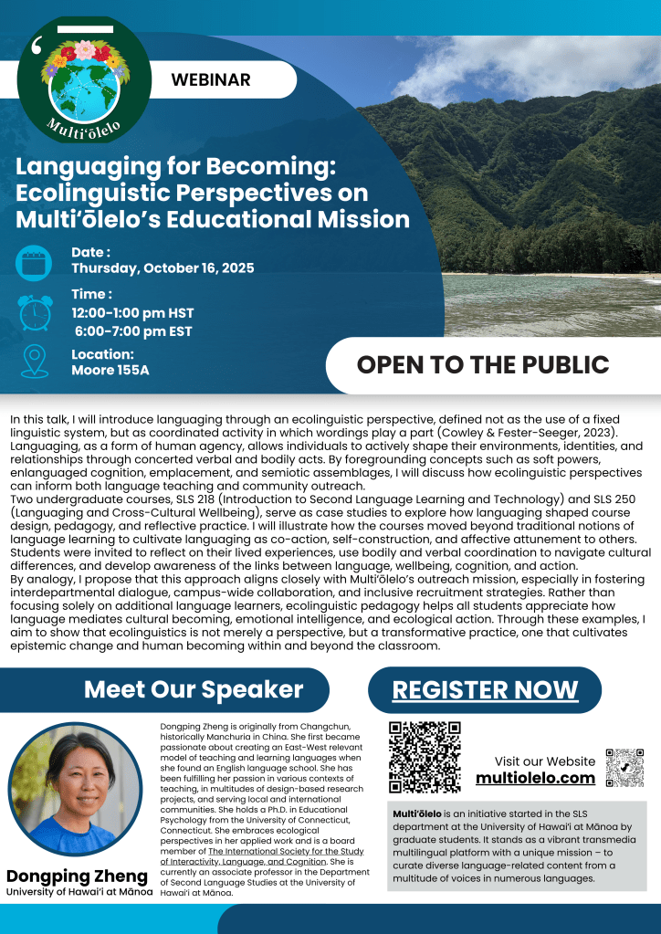 By analogy, I propose that this approach aligns closely with Multiʻōlelo’s outreach mission, especially in fostering interdepartmental dialogue, campus-wide collaboration, and inclusive recruitment strategies. Rather than focusing solely on additional language learners, ecolinguistic pedagogy helps all students appreciate how language mediates cultural becoming, emotional intelligence, and ecological action. Through these examples, I aim to show that ecolinguistics is not merely a perspective, but a transformative practice, one that cultivates epistemic change and human becoming within and beyond the classroom.