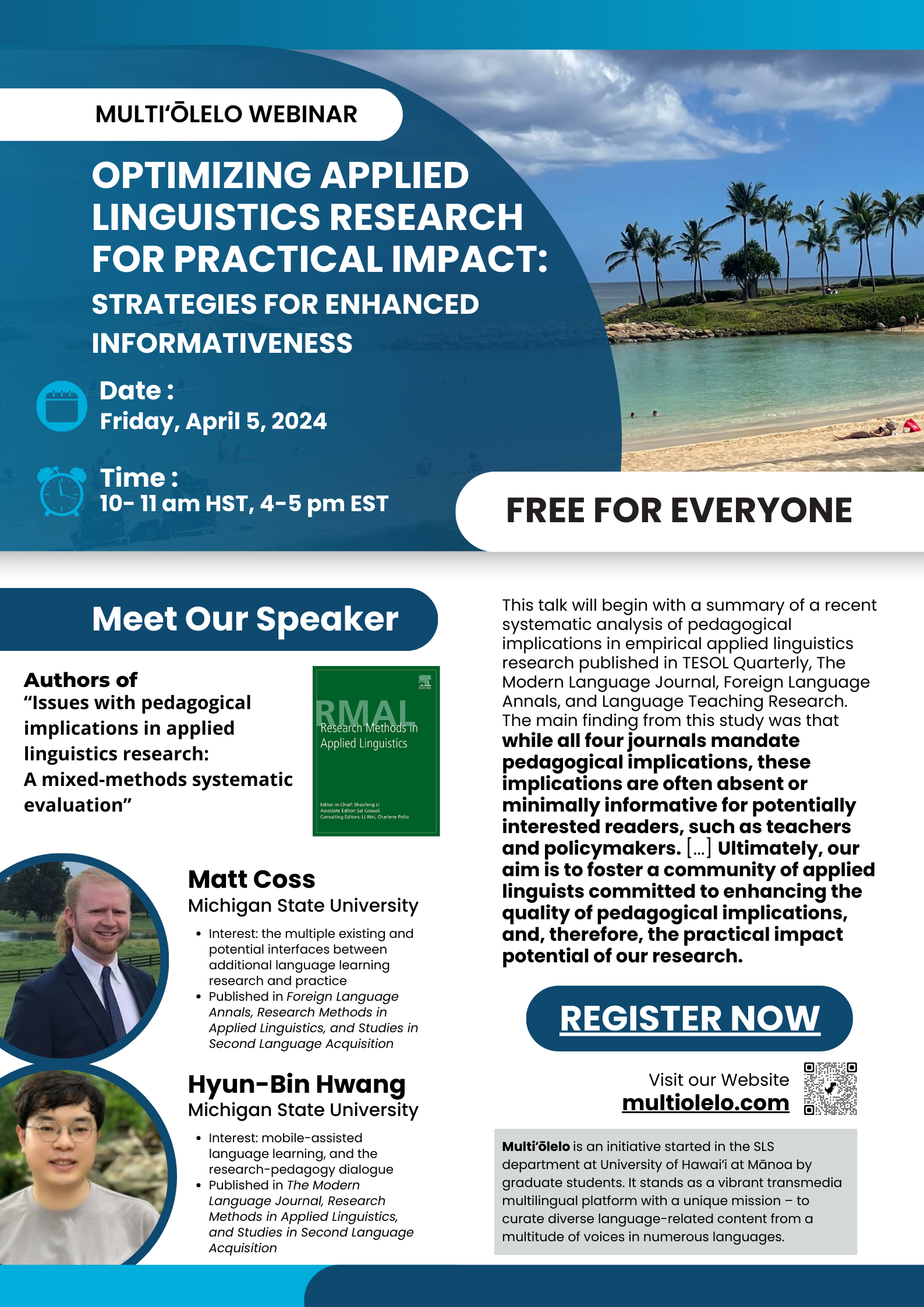 This talk will begin with a summary of a recent systematic analysis of pedagogical implications in empirical applied linguistics research published in TESOL Quarterly, The Modern Language Journal, Foreign Language Annals, and Language Teaching Research. The main finding from this study was that while all four journals mandate pedagogical implications, these implications are often absent or minimally informative for potentially interested readers, such as teachers and policymakers. A second key finding, derived from a move-step genre analysis of 200 pedagogical implications, identified common features of highly informative ones. Based on these findings, we will present attendees (researchers, journal reviewers, and editors) with a series of recommendations to enhance the effectiveness and informativeness of pedagogical implications in research publications. Specifically, we will present a framework for study conceptualization and evaluation. Following this, we will dissect the move-step rhetorical structure of highly informative implications. At the end of the talk, attendees will have the tools to analyze the pedagogical relevance of and improve the pedagogical implications in their own research as well as provide constructive feedback on pedagogical implications when reviewing and editing colleagues’ work. Ultimately, our aim is to foster a community of applied linguists committed to enhancing the quality of pedagogical implications, and, therefore, the practical impact potential of our research.